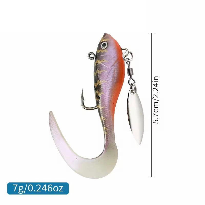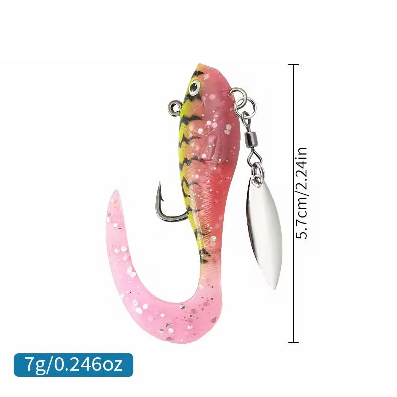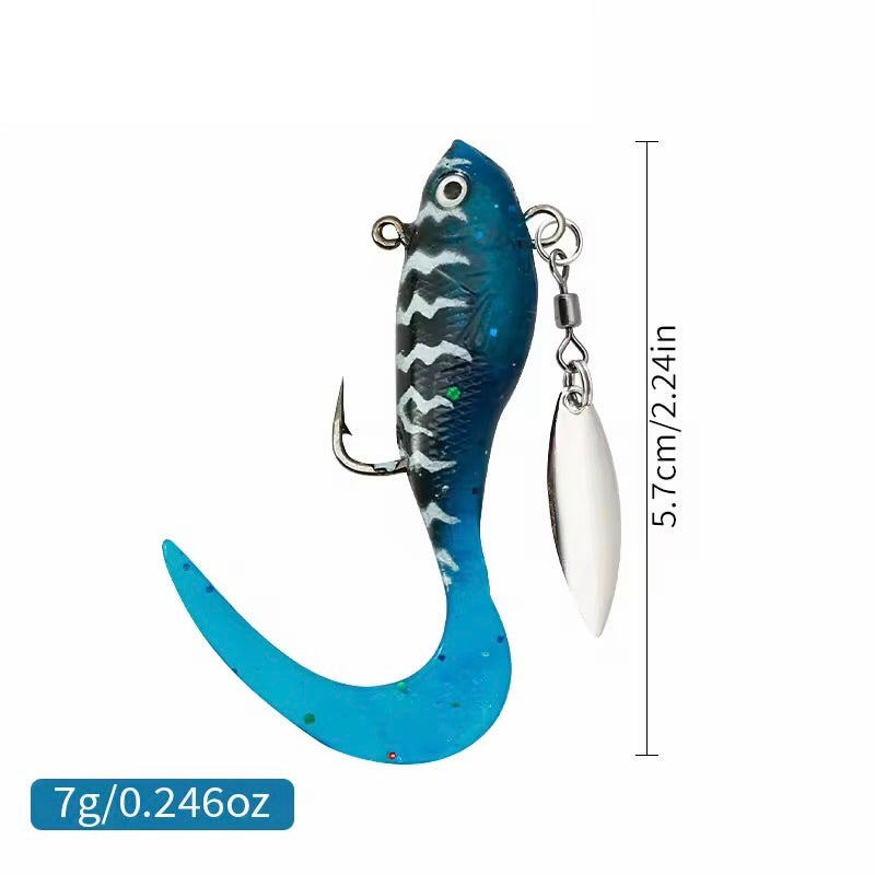 Dieses Gummiköder Set sorgt durch rotierendes Spinnerblatt und flexible Softbaits für starke Aufmerksamkeit unter Wasser.