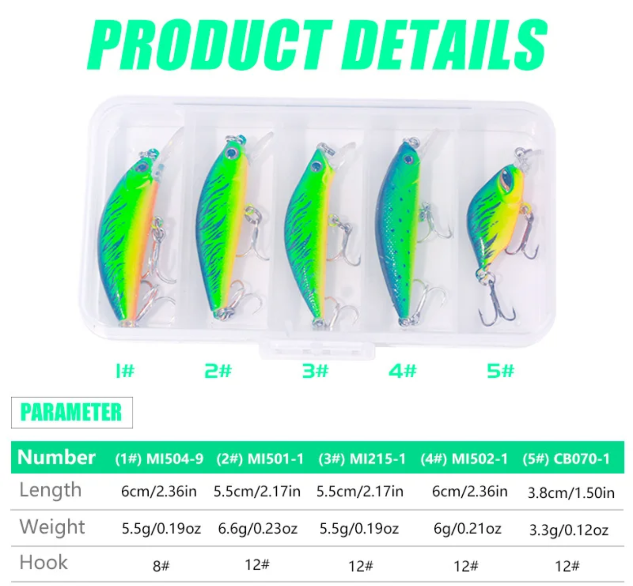 Dieses 5-teilige Wobbler-Set ist ideal für das Spinnfischen auf Raubfische im Süßwasser. Die unterschiedlich geformten Kunstköder ermöglichen abwechslungsreiche Laufbewegungen und decken verschiedene Lauftiefen ab.